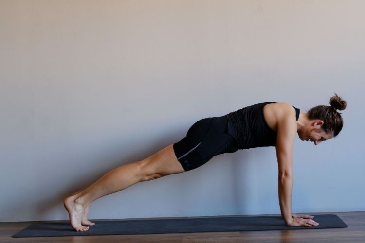This traditional forward bend can be restful and rejuvenating. Practising this pose can help to relieve back pain. From Table Top position, as you inhale, curl your toes and lift your knees up off the mat. As you exhale, extend your hips up towards the ceiling so that your body forms a triangle-like shape or inverted V. Bend your knees slightly if needed, especially as your body warms up. On your next inhale drop your hips and move into High Plank. Adjust your hands if you need to for the first transition, then keep them where they are as you exhale and come back into Downward-facing Dog.